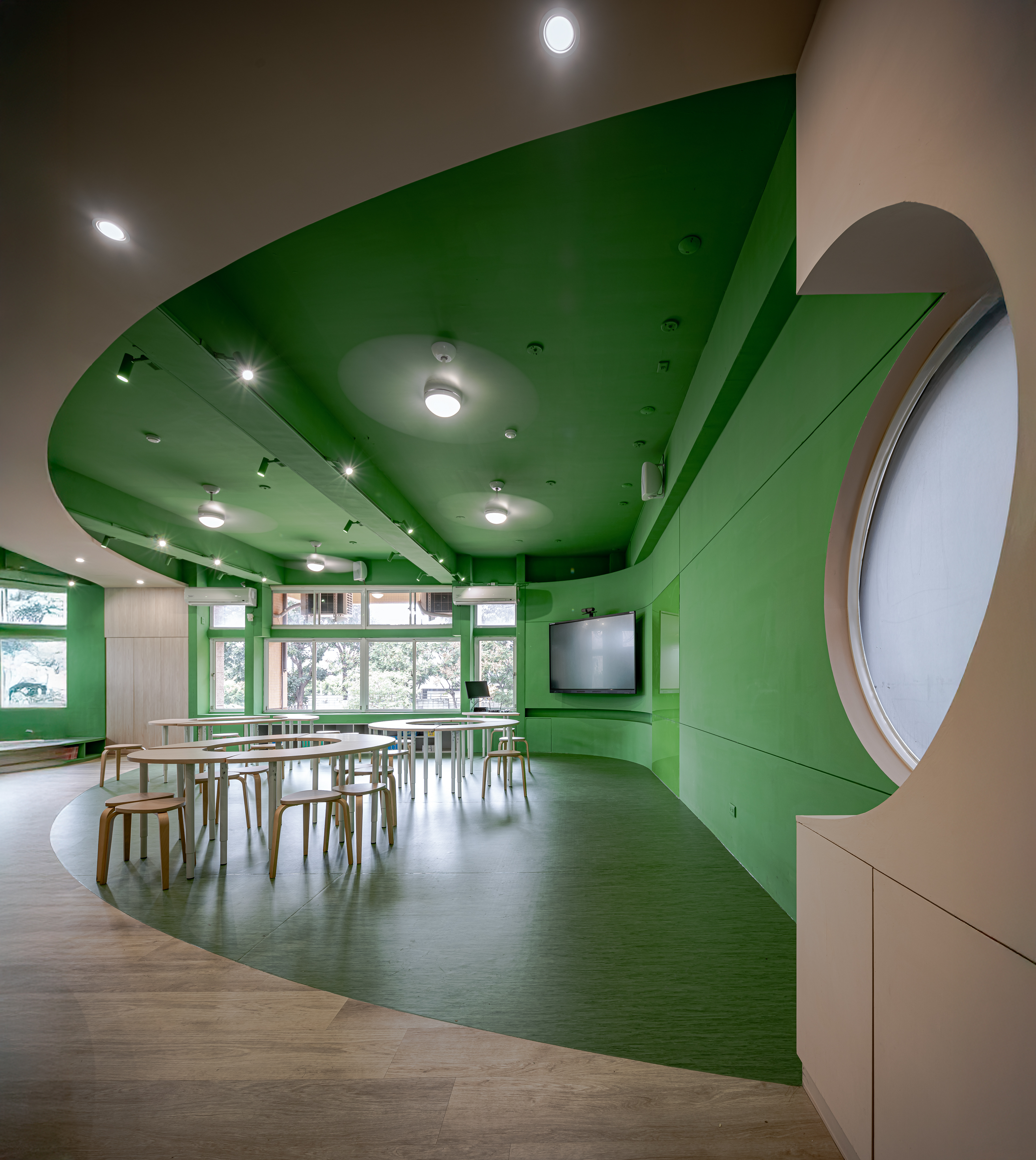 包裹教室內部的綠,抽象的將窗外樹景延伸至內部;