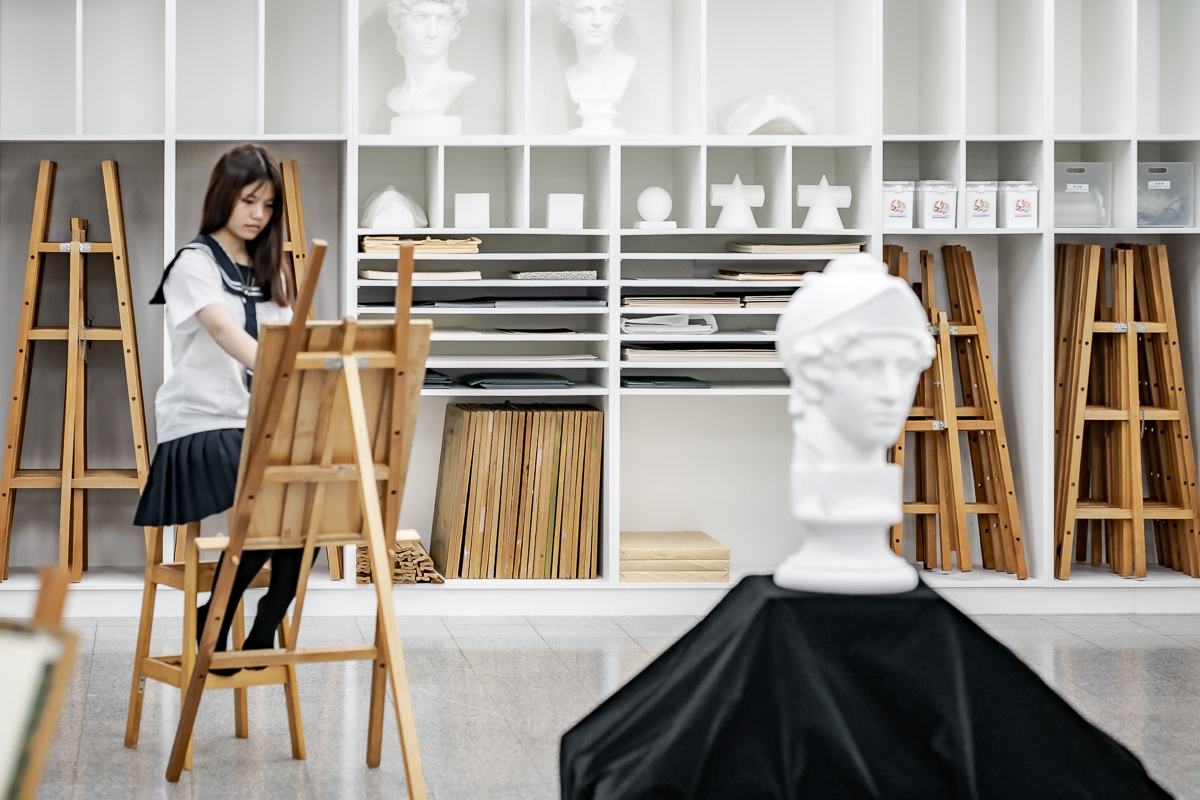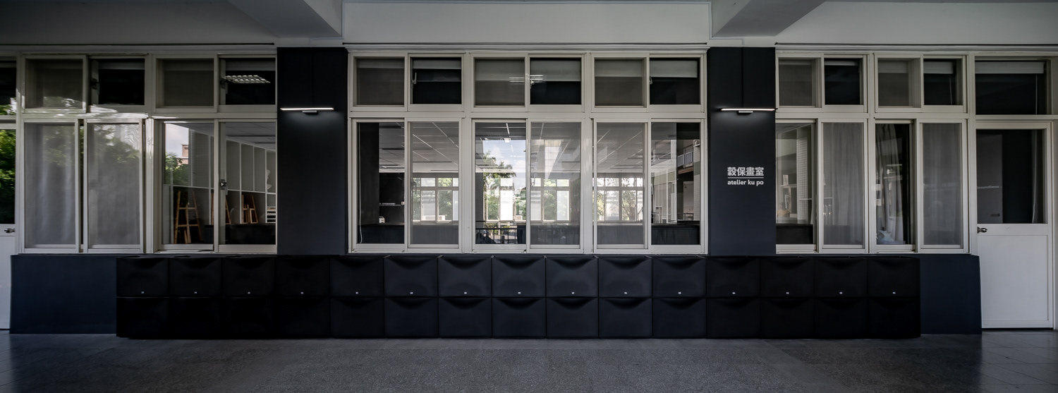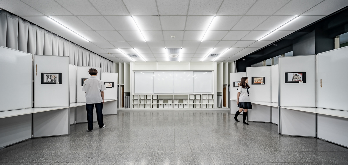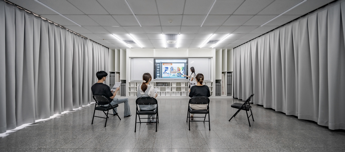 天花板燈條被轉化為界定並引導使用行為的空間系統,作為桌椅、畫架與活動配置的參照依據,協助師生快速切換繪畫、討論、研習、實作與發表等多元使用模式。黑色側牆結合窗簾系統,建立「獨立迴圈」與「開合介面」兩大空間機制,使教學、操作與展覽得以在同一場域中轉換,同時整合教室與走廊的展示動線,讓學習活動自然向公共空間延伸,形塑一處具教育價值、使用清晰且可持續運作的當代畫室。
