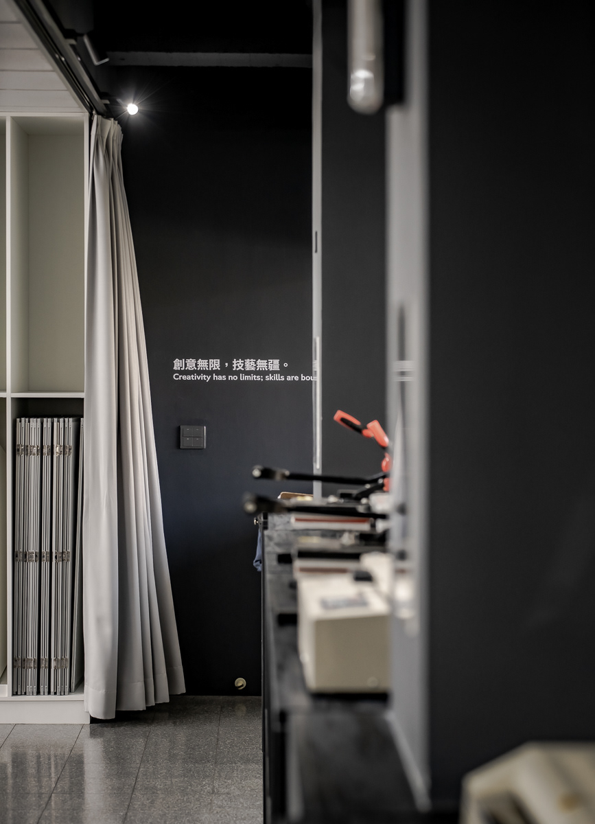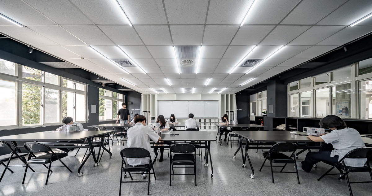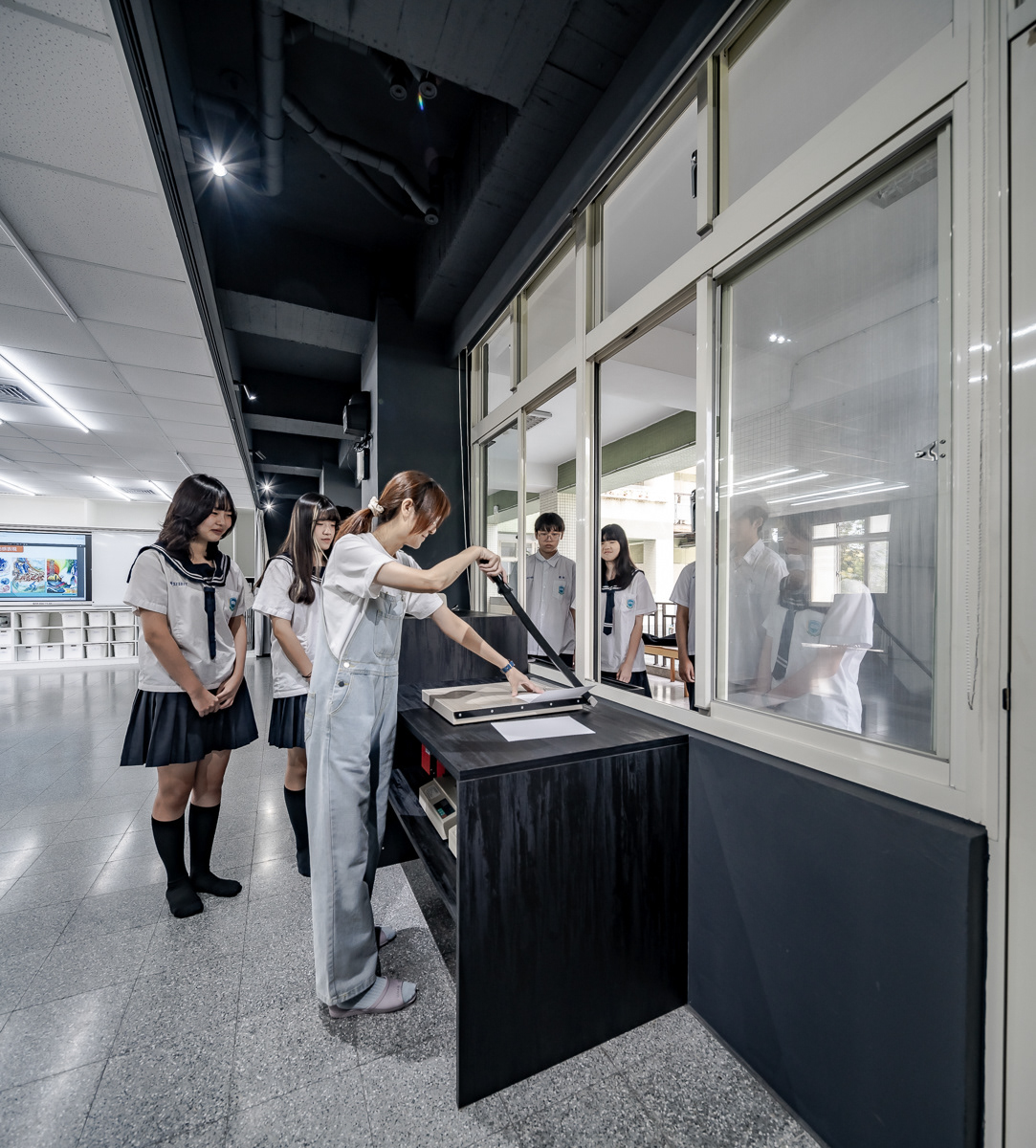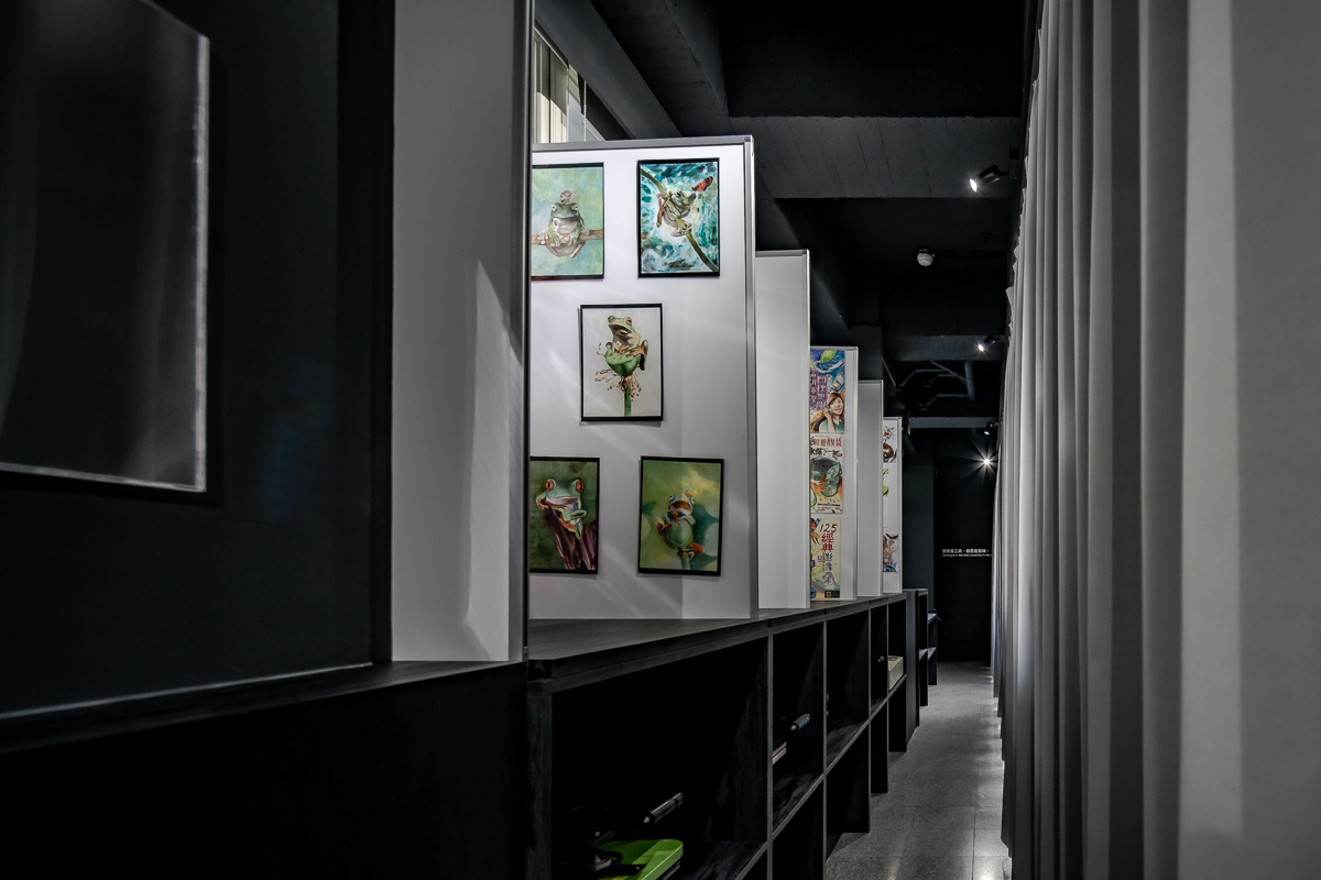 天花板燈條被轉化為界定並引導使用行為的空間系統,作為桌椅、畫架與活動配置的參照依據,協助師生快速切換繪畫、討論、研習、實作與發表等多元使用模式。黑色側牆結合窗簾系統,建立「獨立迴圈」與「開合介面」兩大空間機制,使教學、操作與展覽得以在同一場域中轉換,同時整合教室與走廊的展示動線,讓學習活動自然向公共空間延伸,形塑一處具教育價值、使用清晰且可持續運作的當代畫室。