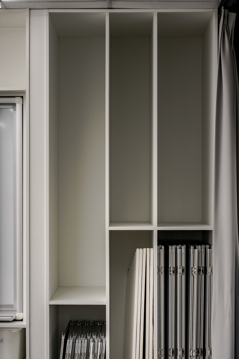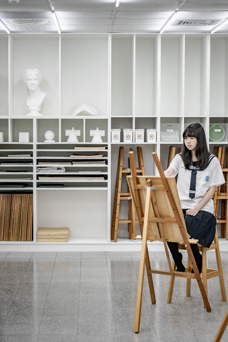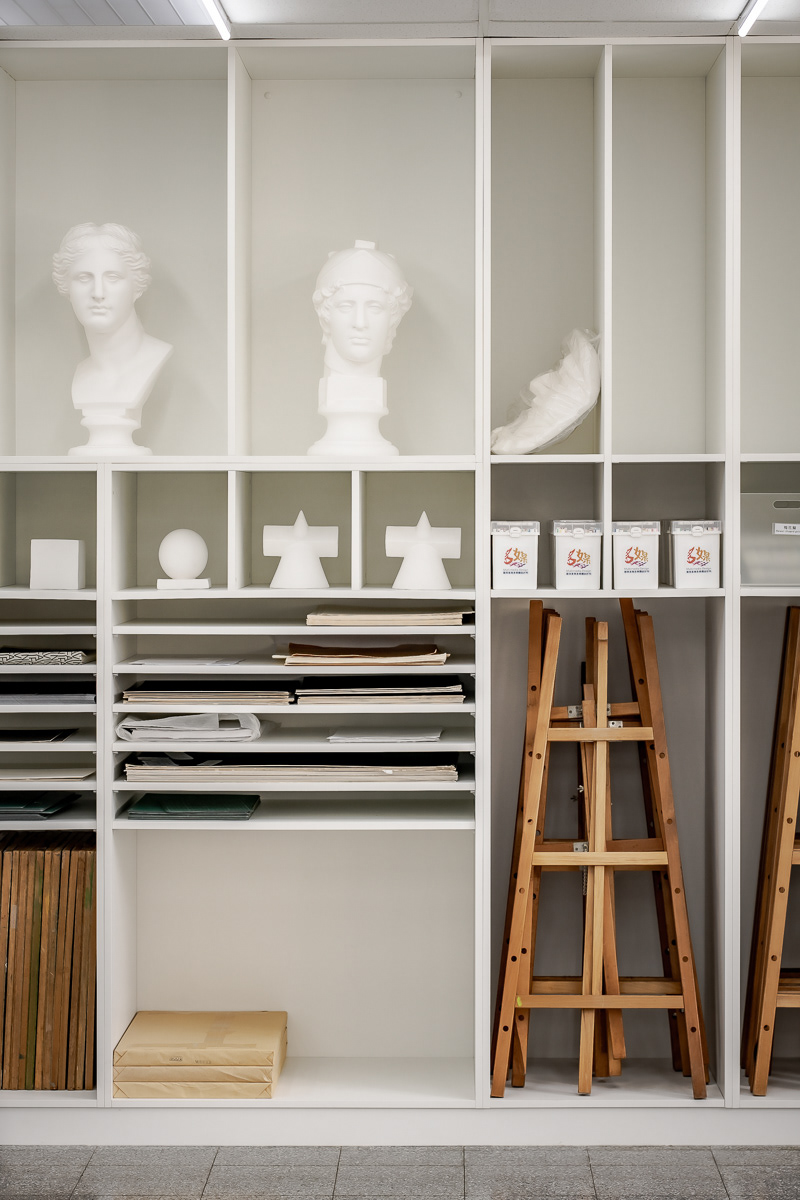 空間重新界定「操作、活動、收納」三個介面,並以「四周收納、中央釋放」的設計策略,將繪畫工具與教學物件集中於四向立面,使中央空間得以完全留白,形成可因應教學、操作與展示需求彈性轉換的核心場域。立面分割回應既有工具尺寸,建立被動引導的使用秩序,使學生在日常使用中自然理解工具位置與操作邏輯。