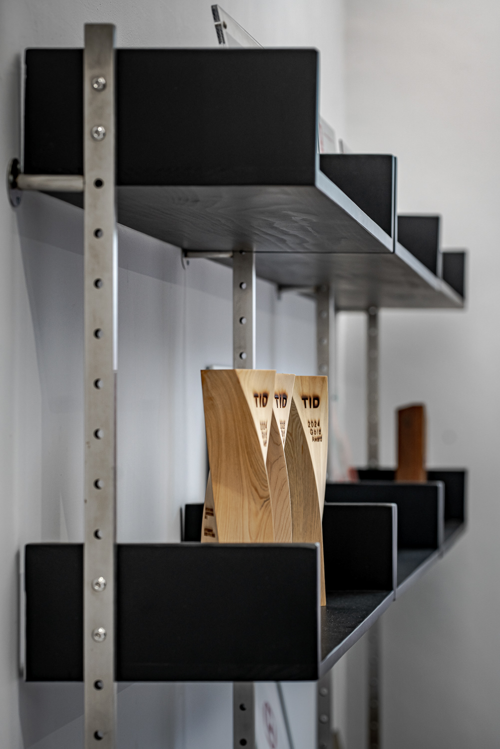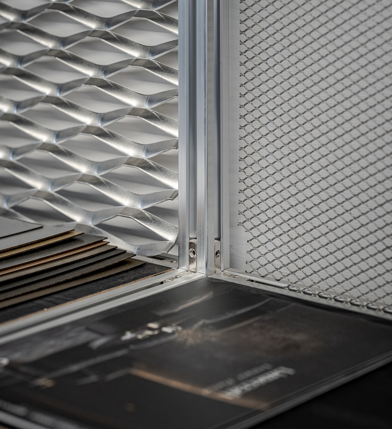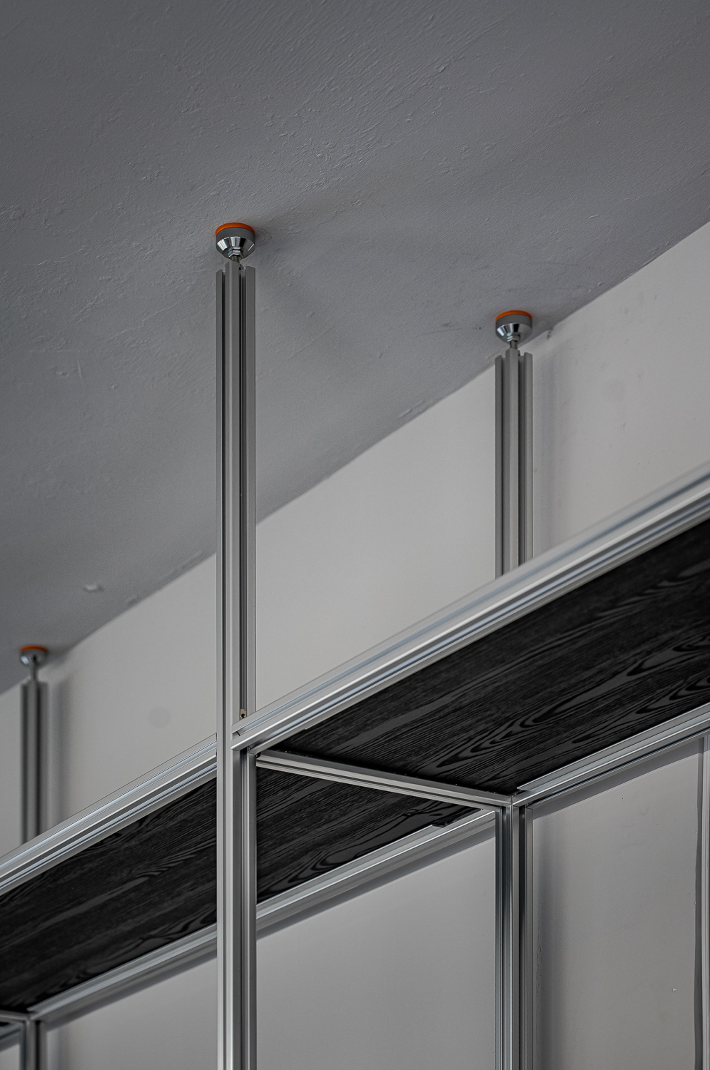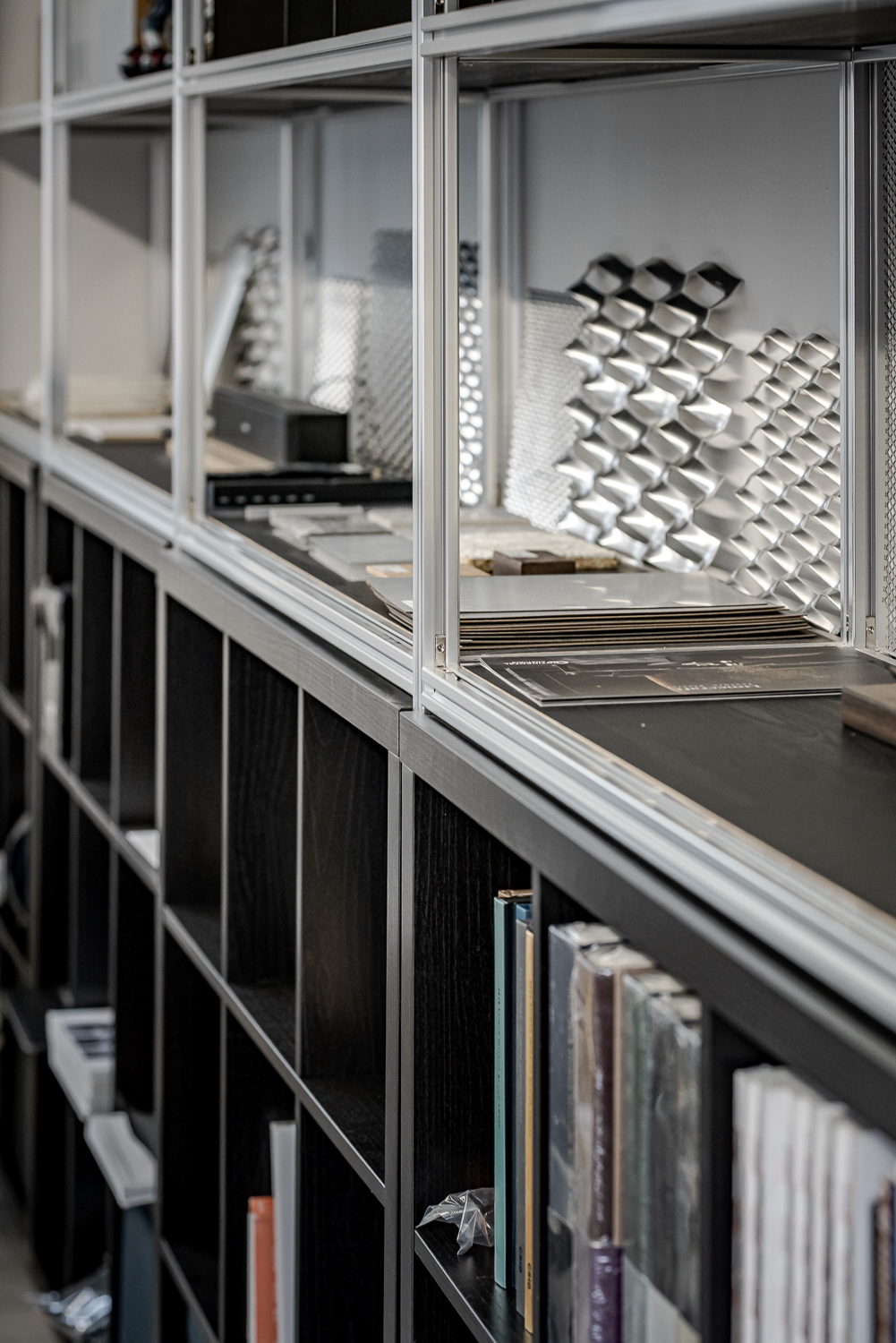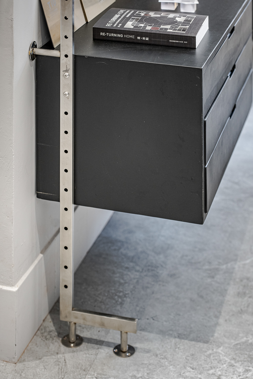 鋁型材的組構性與輕巧特質,結合現成模組櫃體,發展出具收納機能且不干擾原有建築的輕型單元;桌面則採用回收自台南建築展的木夾板,搭配帶有台灣生活記憶的「辦桌鐵腳」,將展覽遺緒與日常風景重新組構為新的創作場景,使材料再利用成為時間延續的另一種書寫。